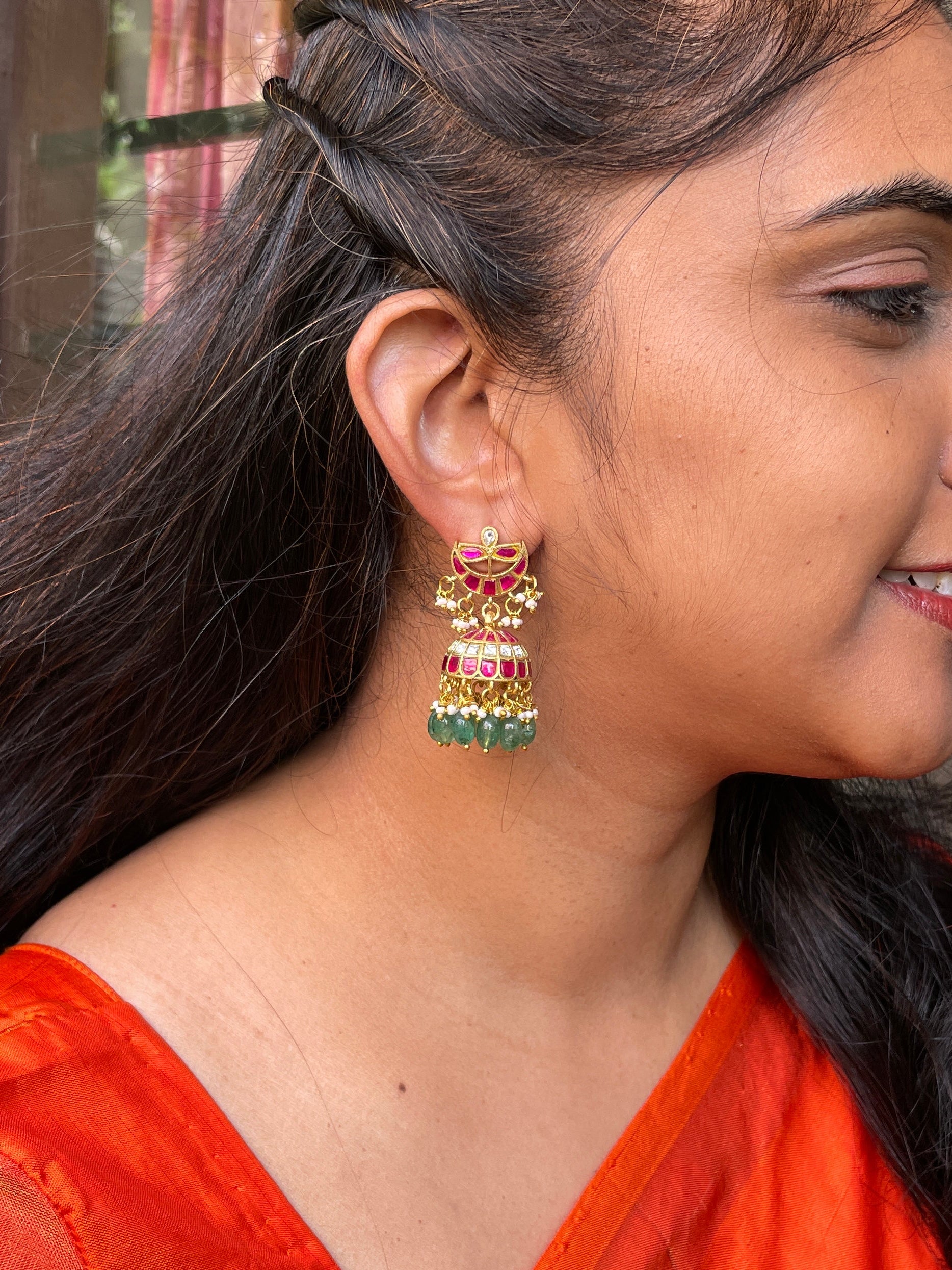 The earring is made in semi-precious Kundan stones, pearls and beads.